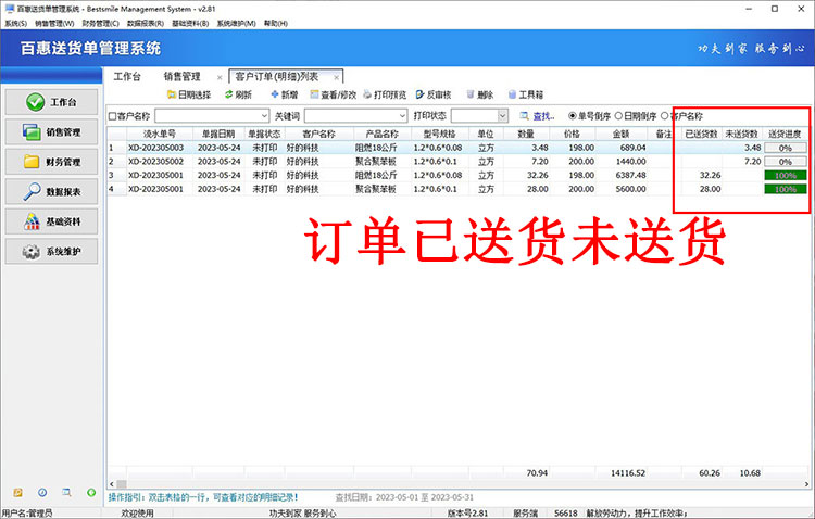 百惠送货单管理系统,从客户订单,送货单,对账单,收款单等流程化管理。实现订单进度跟踪,销售订单一键引入到送货单,自动计算客户订单完成进度! 系统支持设置调整显示列,设计打印模板等功能,个性化制作专属软件使用。